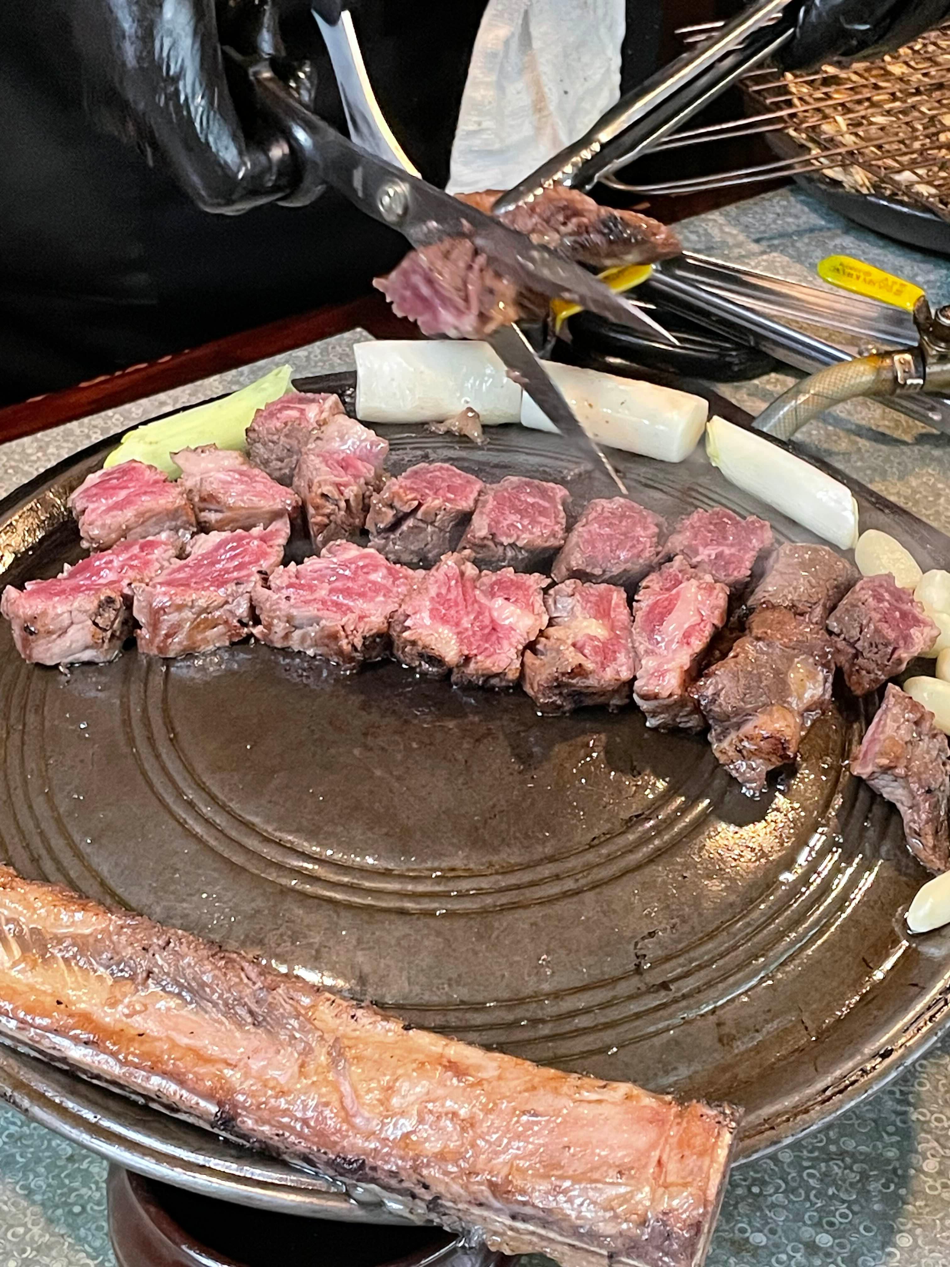 사진에서 보듯, 초벌로 숯불 위에 통으로 구운 우대갈비는 도착하자마자 눈으로 한 번, 향으로 두 번, 그리고 입으로 세 번 감탄하게 만듭니다.